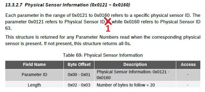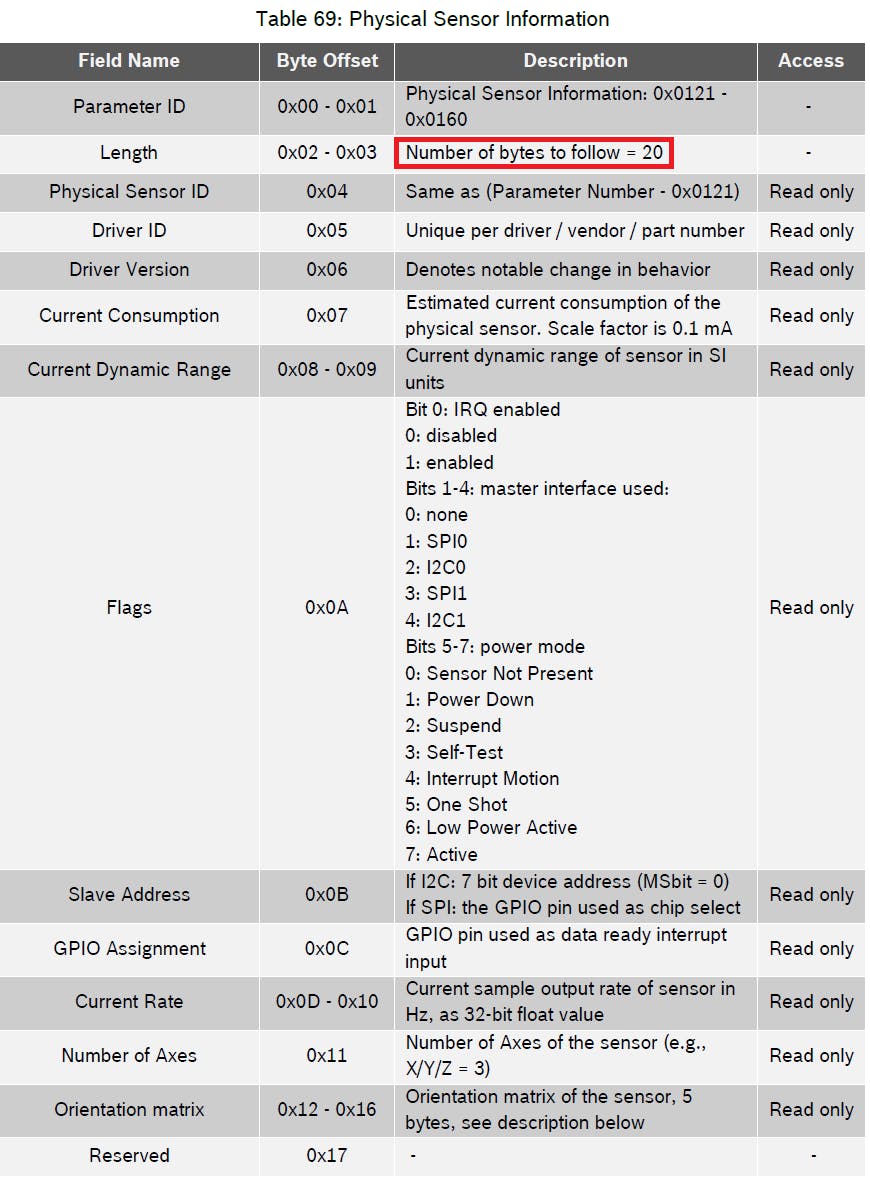 After setting the orientation matrixes of the three physical sensors, I attempt to read the "Physical Sensor Information" parameters from the Parameter Interface. I want to read back the orientation matrixes to verify that they were correctly stored into the chip. For this, I send the following command to the Command Interface (for reading the accelerometer parameters):