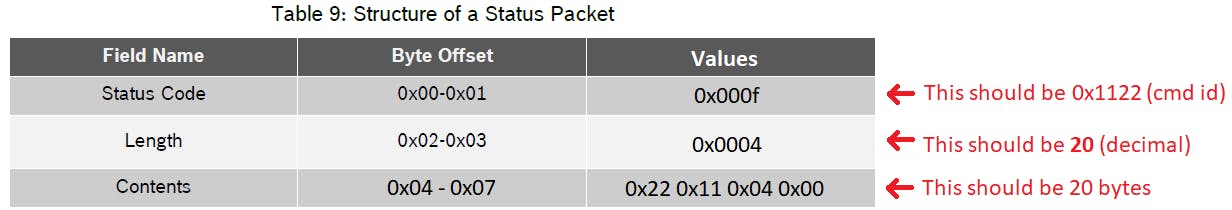 According to the datasheet, I should get the following information on the Status and Debug FIFO (payload of 20 bytes):