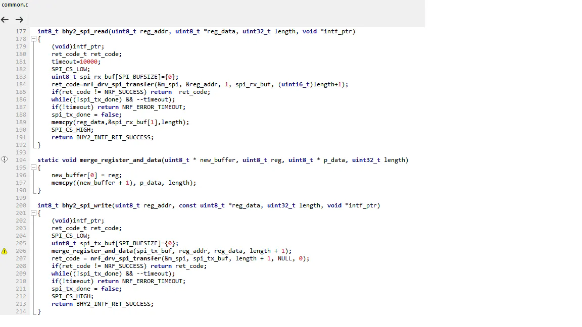 I am using NRF52832. In the sample code I have set common.c and common.h according to NRF52832. I'm reading parts like Product ID correctly, the value is 0x89. rslt=bhy2_upload_firmware_to_ram(bhy2_firmware_image, sizeof(bhy2_firmware_image), &bhy2); When it comes to the part, it reads as rslt=0xfb, that is -3. I am using Bosch_APP30_SHUTTLE_BHI260_aux_BMM150.fh.h firmare image. When this happens, the kernel version is read incorrectly with a value of 0. Do you think spi communication software is wrong or I have to do something else?