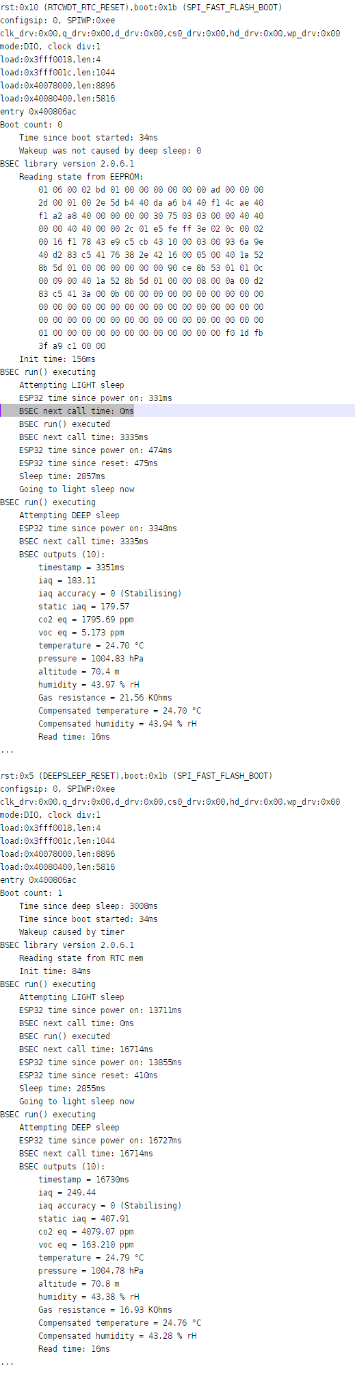 I've hit an issue I'm unable to solve whereby after deep sleeping my ESP32 and saving and loading state with RTC memory or after a manual reset using EEPROM as per the Arduino example basic_config_state.ino, my callback is not being invoked until I execute Bsec2::run() for a second time after deep sleeping. This means I have to I have to wait either 3s or 300s depending on BSEC_SAMPLE_RATE_* at full power or at least light sleep before getting a reading and returning to deep sleep.