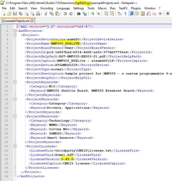 I am a new user of bmf055. I have installed atmel 7 and try to open the example project bmf055_data_stream_astamd20j18. But it fails with the pop-up window saying, an error occured when processing the licence agreement acceptance, thirdparty\cmsis\license.txt requested from atmel.asf-3.26.0 which is not installed in the system.