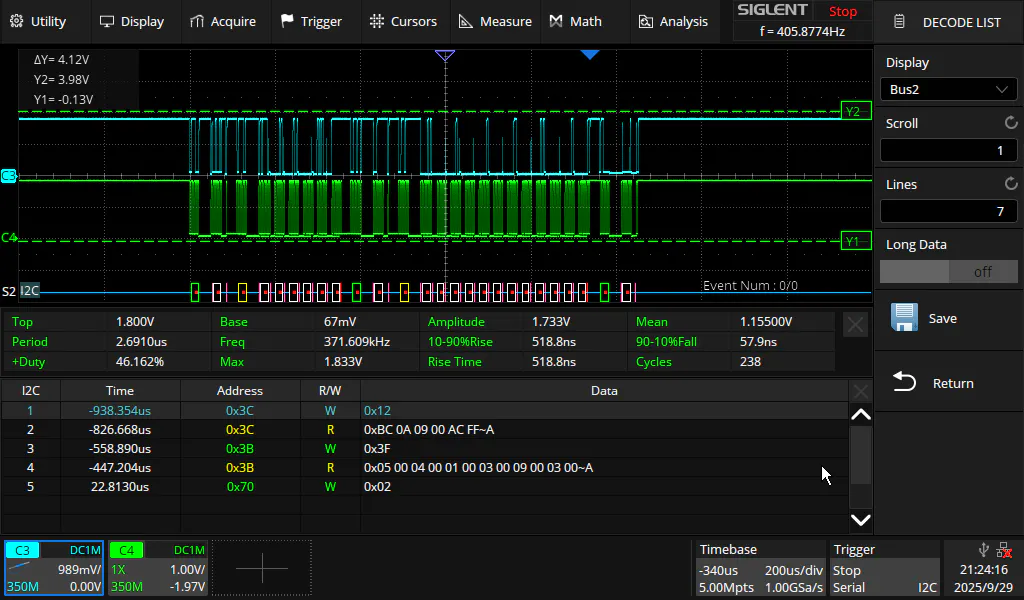 ~1.1ms Read Example of a Gyro 2 Packet (12bytes) over the Oscilloscope DECODE.