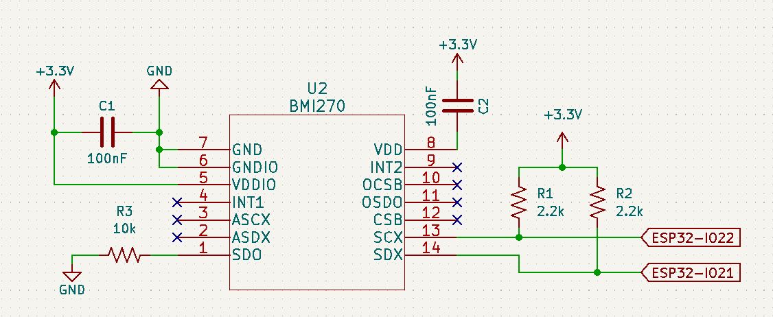 Hello, I'm desiging a small PCB to place the BMI270 on. I'll have it connected to my ESP32 (a Sparkfun 'Thing') via I2C. I've drawn up a schematic which I based off of an existing Sparkfun breakout board. The schematic for the product can be found here.