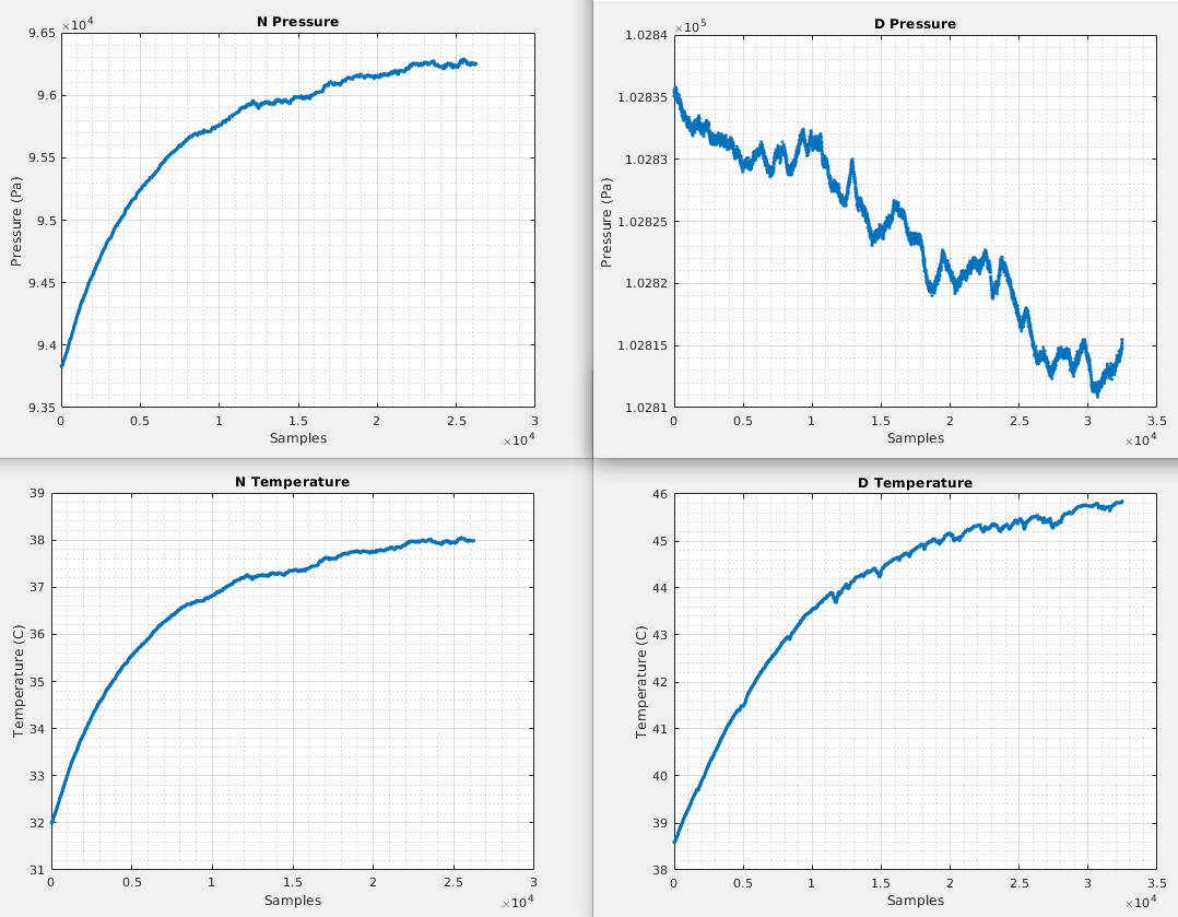 I've got two BMP581 sensors. One reports the correct pressure (see right hand plots), the other does not and has a strong correlation with temperature (see left hand plots).