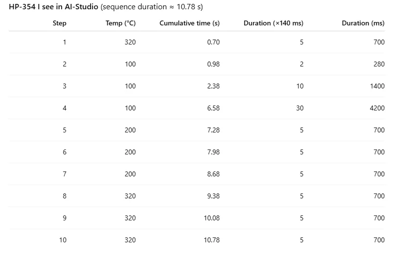 (I also saw forum snippets stating the duration unit is 140 ms — please confirm this is correct for HP-354.)Questions