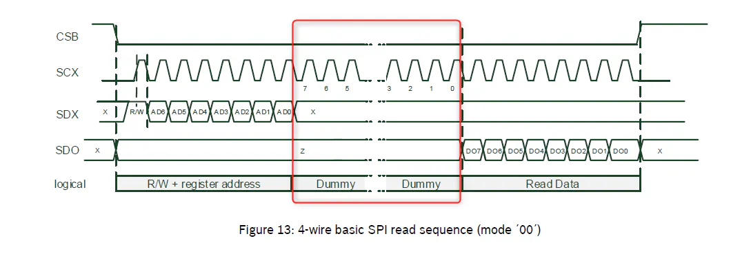 Please note that the first byte received from the device via the SDO line corresponds to a dummy byte and the second byte corresponds to the value read out of the specified register address.